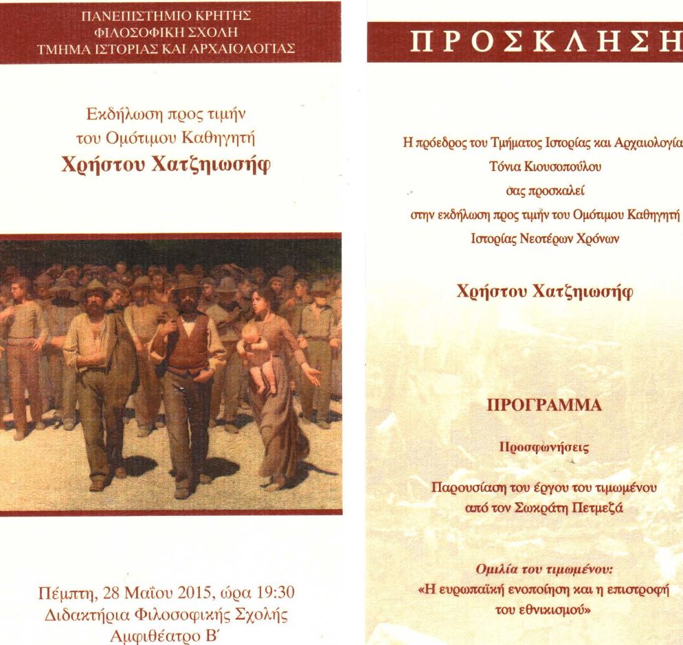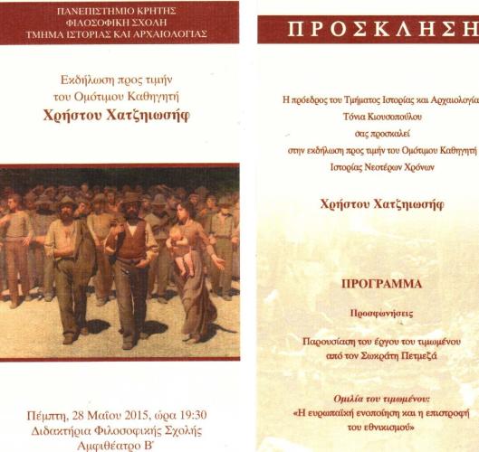 Το Πανεπιστήμιο Κρήτης και το Τμήμα Ιστορίας και Αρχαιολογίας του Πανεπιστημίου Κρήτης θα απονείμει στoν κ. Χρήστο Χατζηιωσήφ, Καθηγητή Ιστορίας Νεοτέρων Χρόνων και Διευθυντή του Ινστιτούτου Μεσογειακών Σπουδών του Ιδρύματος Τεχνολογίας και Έρευνας, τον τίτλο του Ομότιμου Καθηγητή του Πανεπιστημίου Κρήτης, την Πέμπτη 28 Μαΐου 2015, και ώρα 19.30, στο Αμφιθέατρο Β΄ της Φιλοσοφικής Σχολής στο Ρέθυμνο.
