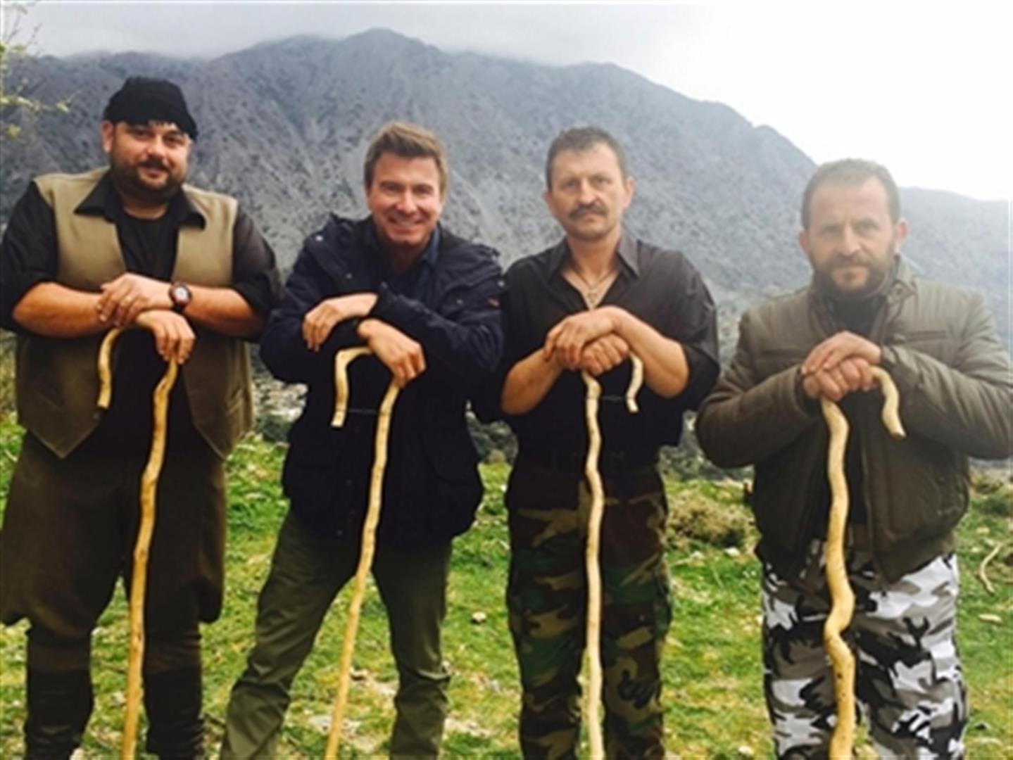 Εκστασιασμένος ανακαλύπτει την κρητική φιλοξενία στο πανηγύρι του Άη Γιώργη του Γαλατά στην Ασή Γωνιά, τσουγκρίζει το ποτήρι του και φωτογραφίζεται με κατσούνα ανάμεσα σε βοσκούς της περιοχής.
