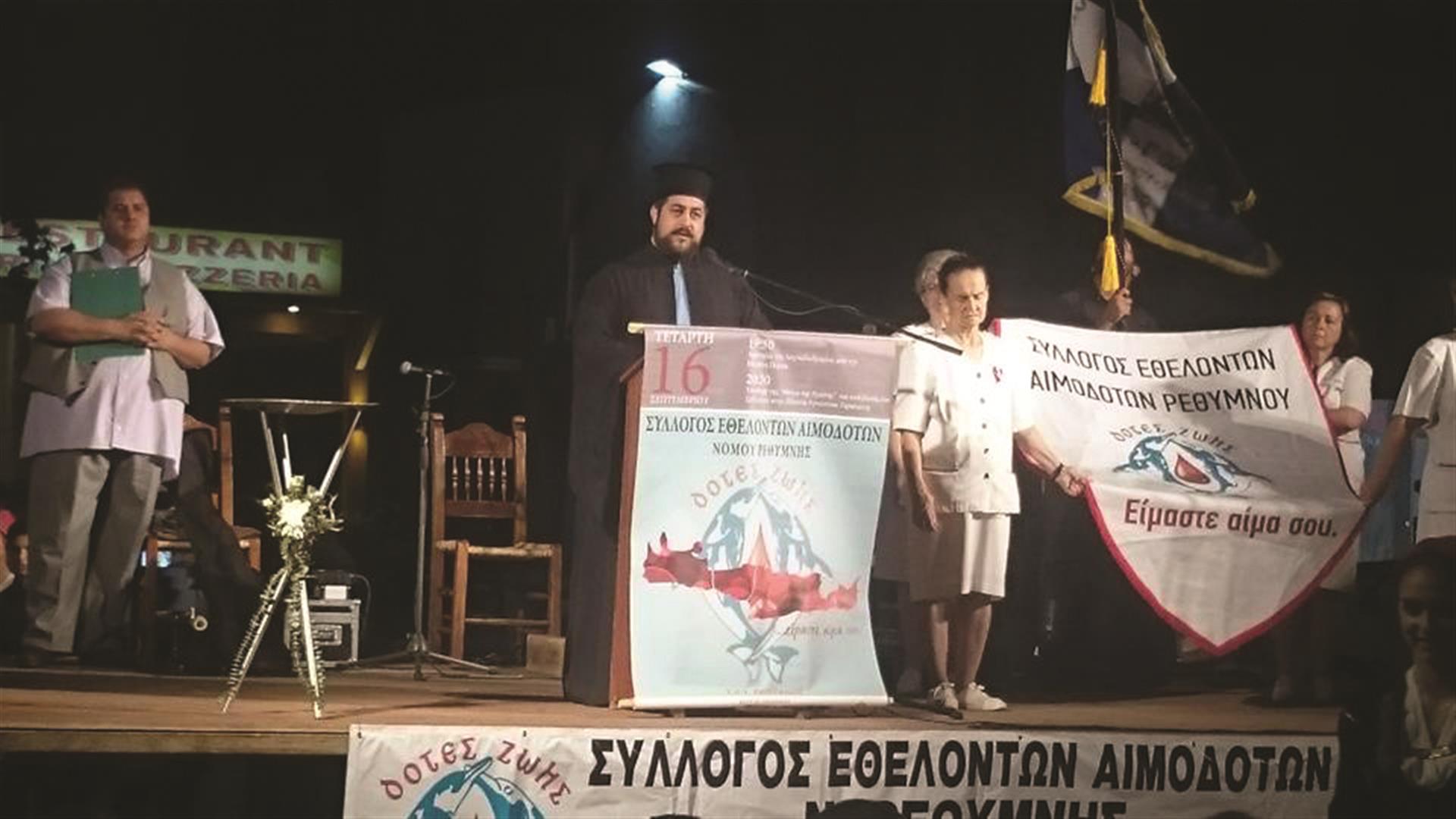 Την κεντρική ομιλία πραγματοποίησε ο Πρόεδρος του Συλλόγου Αιμοδοτών Ρεθύμνου «Δότες Ζωής» π. Γεώργιος Γαλεράκης, ο οποίος αναφέρθηκε στα μηνύματα της αλληλεγγύης και της ζωτικής συμβολής του εθελοντή αιμοδότη στην στήριξη των συνανθρώπων μας που έχουν ανάγκη σε κάποια στιγμή της ζωής τους.
