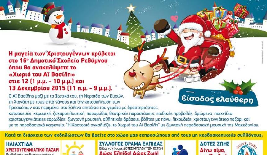 Η μαγεία των Χριστουγέννων κρύβεται και φέτος στο 16ο Δημοτικό σχολείο Ρεθύμνου όπου θα ανακαλύψετε το "Χωριό του Αϊ Βασίλη" στις 12 (1μ.μ.-10μ.μ) και 13 Δεκεμβρίου 2015 (11π.μ.-9μ.μ). Είσοδος ελεύθερη