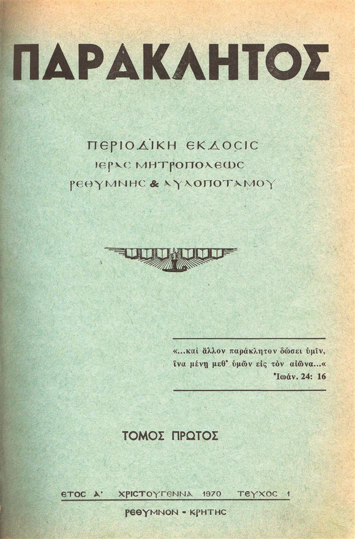 - ΠΑΡΑΚΛΗΤΟΣ, τόμοι δέκα επτά (1970-1987), τεύχη 1-51. Περιοδική έκδοση της Ιεράς Μητροπόλεως Ρεθύμνης και Αυλοποτάμου, που ολοκληρώθηκε με τον τόμο «Αφιέρωμα εις Μνήμην Μητροπολίτου Ρεθύμνης και Αυλοποτάμου Κυρού Τίτου 1970-1987» που κυκλοφόρησε το 1988, με μέριμνα του διαδόχου του μακαριστού Μητροπολίτη Θεοδώρου Τζεδάκη, επίσης λογίου Ιεράρχη και σπουδαίου Κρητολόγου.