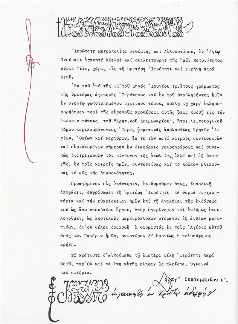 Αφού λοιπόν τόνισε, ότι εγκαινίαζε ναούς στη μνήμη των Κρητών Αγίων αποσκοπώντας στην αναζωπύρωση της ιστορικής μνήμης του «Θεόφρονος» ποιμνίου του, έγραψε μεταξύ άλλων, ότι «Εκ λειτουργικής, όθεν, και εορτολογικής ανάγκης και ενδιαθέτου νοσταλγίας υποκινούμενοι, προέβημεν εις την σταχυολόγησιν προγενεστέρων εκδόσεων, παλαιών κειμένων ή εφθαρμένων χειρογράφων, ομού μετά των εξ’ υπαρχής ποιηθέντων νέων τοιούτων, προκειμένου να φιλοπονήσωμεν και εκδόσωμεν τύποις δύο αυτοτελείς εκδόσεις: α) Κρήτες Άγιοι, τουτέστιν εκλαϊκευμένας βραχυβιογραφίκάς ψυχογραφίας προς κοινωφελή γνώσιν και χρήσιν του Χριστεπώνυμου Πληρώματος, και β) Κρητικόν Λειμωνάριον, τουτέστιν Ιεράς Ακολουθίας των Κρητών Αγίων προς λειτουργικήν χρήσιν και διακονίαν του ιερού αναλογίου του λειτουργημένου χώρου και εορτολογικού χρόνου της Εκκλησίας ημών.»
