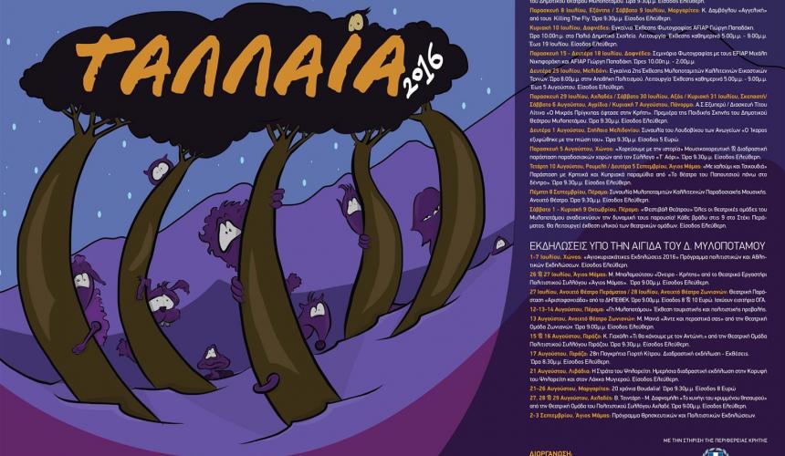 Το φεστιβάλ «Ταλλαία 2016» διοργανώνει ο Οργανισμός Πολιτισμού, Τουρισμού και Νέας Γενιάς Δήμου Μυλοποτάμου «Ο Αυλοπόταμος» με την στήριξη της Περιφέρειας Κρήτης και την συνεργασία των πολιτιστικών φορέων και των Τοπικών Κοινοτήτων των χωριών που φιλοξενούν τις εκδηλώσεις του προγράμματος.