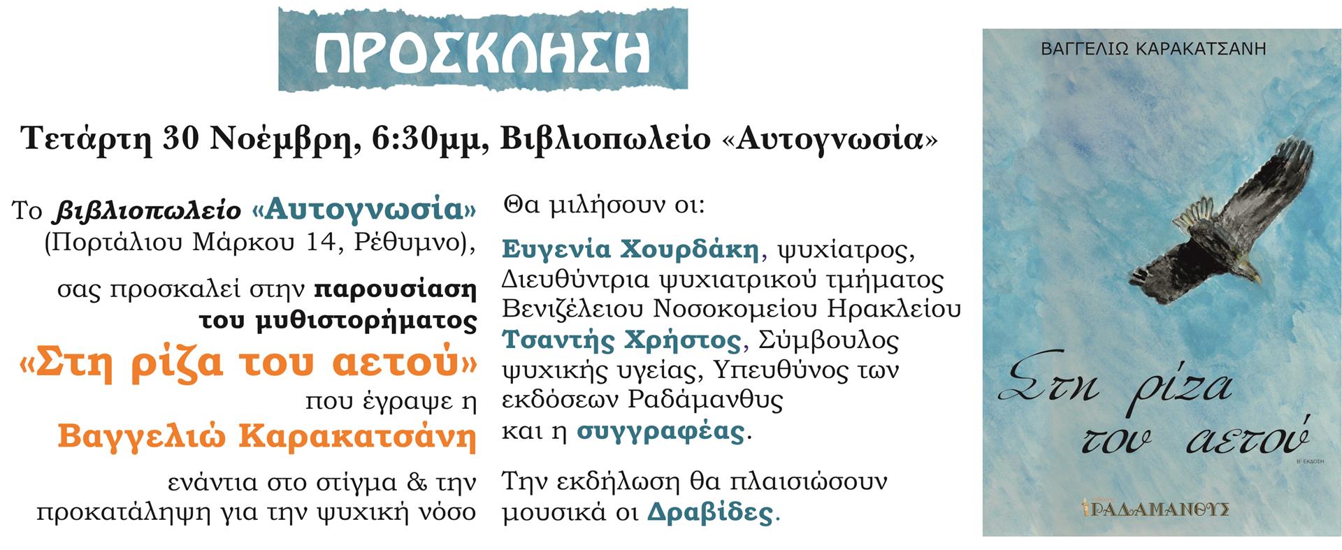 Σε μια ξεχωριστή εκδήλωση που διοργανώνει το βιβλιοπωλείο Αυτογνωσία στον χώρο του- Πορτάλιου Μάρκου 14- με ομιλητές την κ. Χουρδάκη Ευγενία, ψυχίατρο και διευθύντρια του ψυχιατρικού τμήματος του Βενιζέλειου Νοσοκομείου Ηρακλείου, τον Χρήστο Τσαντή, Σύμβουλο ψυχικής υγείας, υπεύθυνο των εκδόσεων Ραδάμανθυς και τη συγγραφέα Καρακατσάνη Βαγγελιώ, Πρόεδρο του Δ.Σ. του Παγκρήτιου Σωματείου ενάντια στο στίγμα για τις ψυχικές διαταραχές.