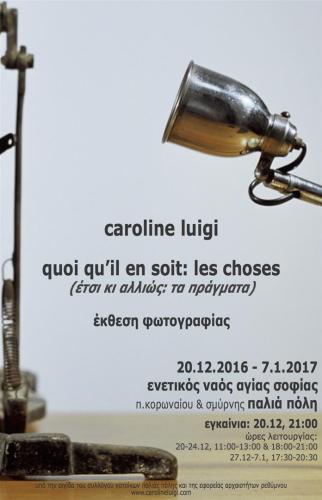 O Σύλλογος Κατοίκων Παλιάς Πόλης Ρεθύμνου υπό την αιγίδα της Εφορείας Αρχαιτήτων Ρεθύμνου παρουσιάζει την έκθεση της εικαστικού Caroline Luigi “quoi qu'il en soit: les choses” (έτσι κι αλλιώς: τα πράγματα) στον Ενετικό Ναό Αγίας Σοφίας στην Παλιά Πόλη. Στην έκθεση παρουσιάζεται δουλειά της των τελευταίων ετών.