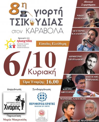Ο Λαογραφικός Όμιλος " Λάζαρος και Μανώλης Χνάρης" σας προσκαλεί  στην 8η Γιορτή Τσικουδιάς, στην παραλία Καράβολα .