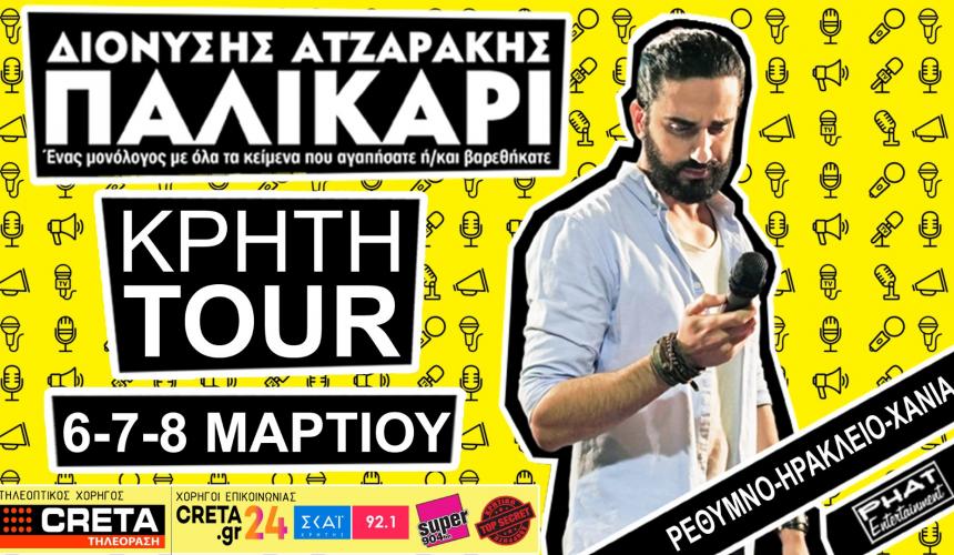 Ο Διονύσης Ατζαράκης συγκεντρώνει σε έναν stand-up comedy μονόλογο όλα τα κείμενα που αγαπήσατε ή/και βαρεθήκατε, και έρχεται για τουρ στην Κρήτη.