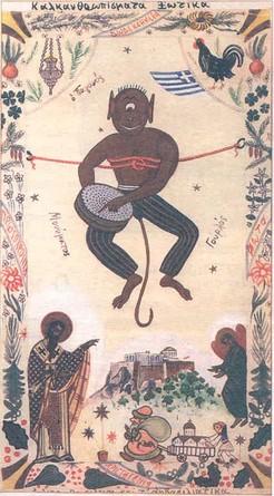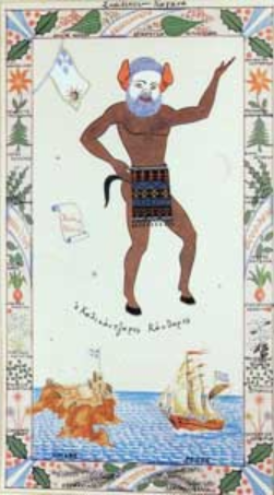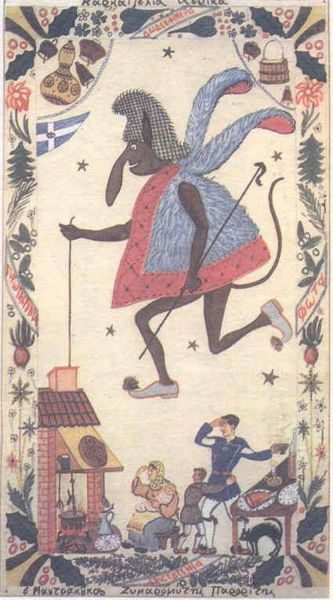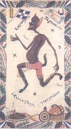 Αυτός ο αρχικαλικάντζαρος την ημέρα κρύβεται στις μάντρες και τη νύχτα βγαίνει και πειράζει τις γυναίκες που περπατούν στο δρόμο. Είναι κοντόχοντρος, τραγοπόδαρος, καραφλός, ασχημομούρης, πιο πολύ απ’ τους άλλους και πολύ επικίνδυνος .