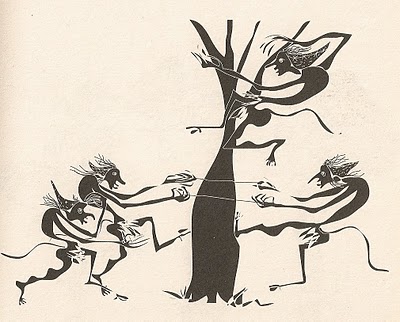 Εκτός του Δωδεκαήμερου τον υπόλοιπο χρόνο μένουν στα έγκατα της γης και πριονίζουν το δέντρο που την κρατά (παραλλαγή του μυθικού Άτλαντα).
