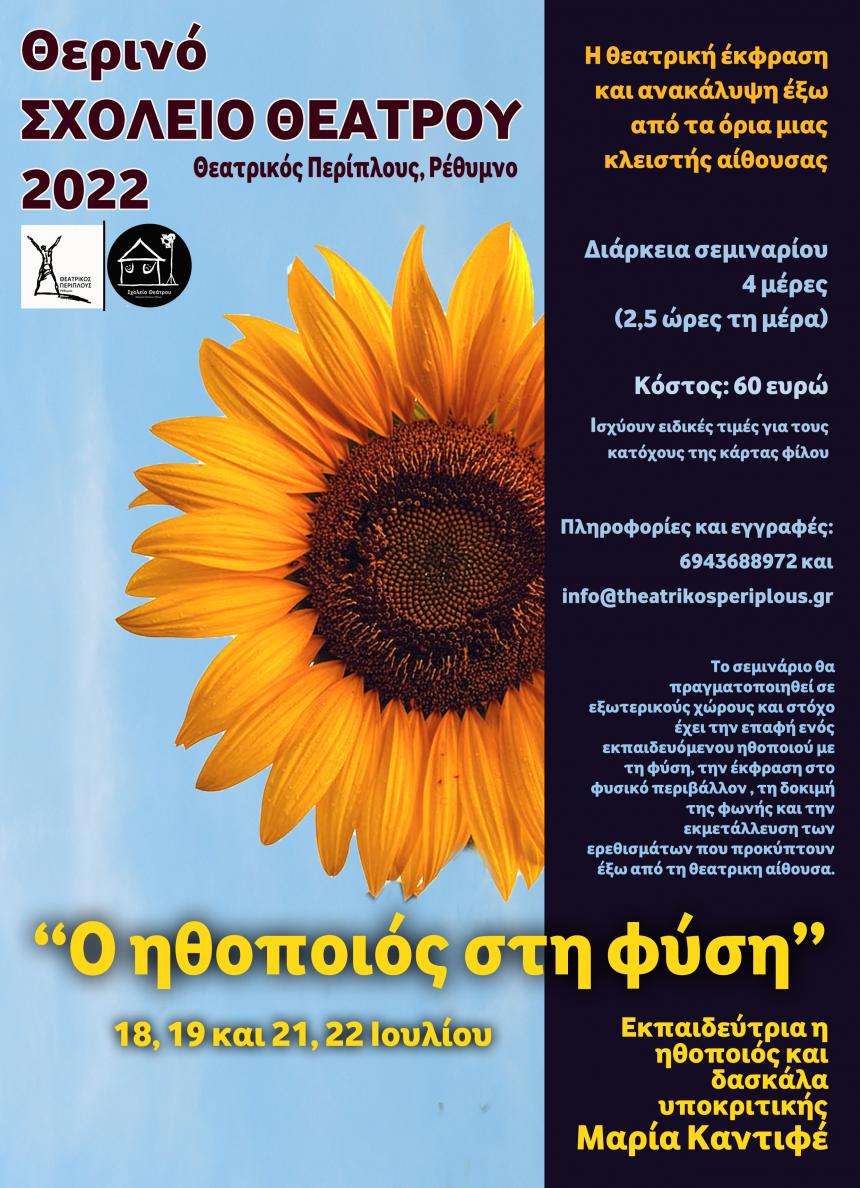 Πρόκειται για ένα σεμινάριο μικρής διάρκειας, το οποίο θα πραγματοποιηθεί στο Ρέθυμνο, στα πλαίσια του «Θερινού Σχολείου Θεάτρου», με εκπαιδεύτρια την ηθοποιό και δασκάλα υποκριτικής Μαρία Καντιφέ. Τα μαθήματα θα γίνουν σε εξωτερικούς χώρους και στόχο έχουν την επαφή των εκπαιδευόμενων με τη φύση, την έκφραση στο φυσικό περιβάλλον, τη δοκιμή της φωνής και την εκμετάλλευση ερεθισμάτων που προκύπτουν έξω από την θεατρική αίθουσα. Πρόκειται για μια ενδιαφέρουσα και μοναδική εμπειρία που αφορά όχι μόνο εκπαιδευόμενους ηθοποιούς αλλά και όλους όσους θέλουν να έρθουν σε επαφή με τη φύση και τον εαυτό τους με ένα διαφορετικό τρόπο.