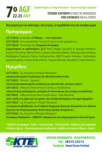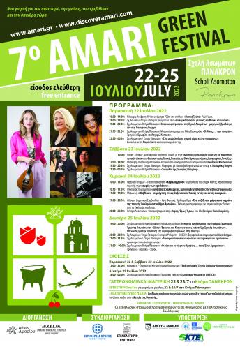 Εθελοντές από την Κρήτη και την υπόλοιπη Ελλάδα, επιστήμονες, καλλιτέχνες, μουσικοί, οι κάτοικοι των χωριών του Δήμου Αμαρίου και οι Πολιτιστικοί Σύλλογοι για τέσσερις ημέρες, θα χαρίσουν απλόχερα τη φιλοξενία, τη γνώση, το ταλέντο και την αγάπη τους, μέσα από τις 30 εκδηλώσεις και δρώμενα του 7ου Amari Green Festival.