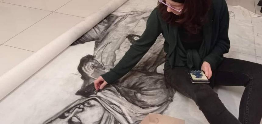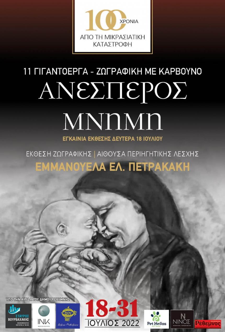 Το κάρβουνο είναι το υλικό που επέλεξε η Ρεθεμνιώτισσα πολιτικός μηχανικός Εμμανουέλλα Πετρακάκη, προκειμένου να εκφράσει μέσα από τη ζωγραφική της, το βαθύ πόνο των Ελλήνων Μικρασιατών, που βίωσαν βασανιστικά τον εκτοπισμό τους από τις αλησμόνητες πατρίδες. Φιγούρες σε φυσικό ή και σε μεγαλύτερο από το φυσικό μέγεθος, πλέκουν το δράμα της καταστροφής και της απελπισίας, ανάμεσα στα φλεγόμενα κτήρια στο λιμάνι της Σμύρνης