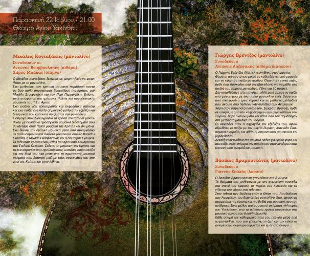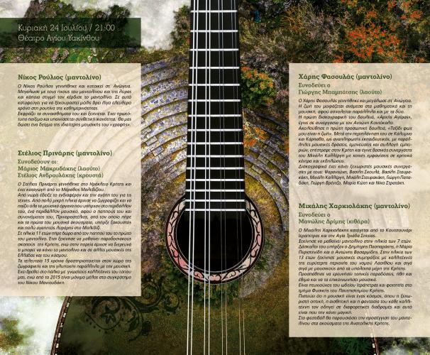 Νίκος Ρούλιος (μαντολίνο) / Στέλιος Πρινάρης (μαντολίνο) με τον Μάριο Μακρυδάκη (λαούτο) και τον Στέλιο Ανδρουλάκη (κρουστά) / Χάρης Φασουλάς (μαντολίνο) με τον Γιώργη Μπαμπάτση (λαούτο) / Μιχάλης Χαρκιολάκης (μαντολίνο) με τον Μανώλη Δρίμη (κιθάρα).