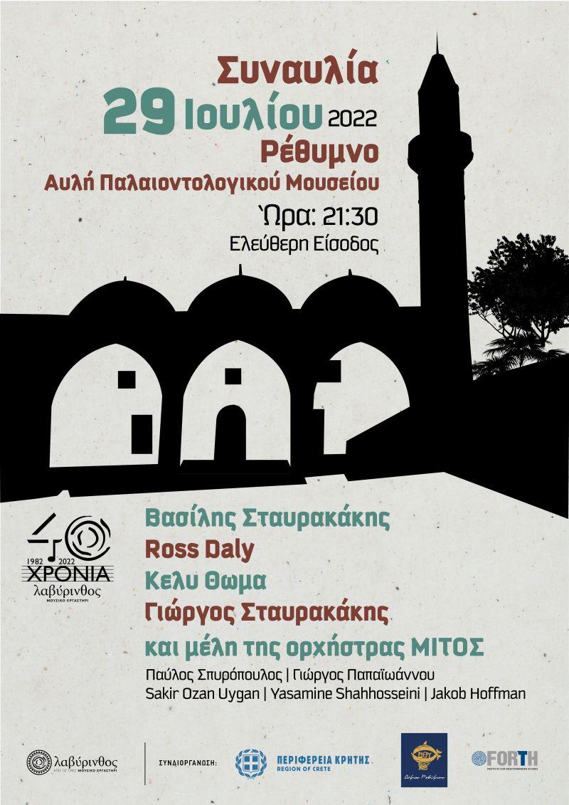 Στις 29 Ιουλίου στην αυλή του Παλαιοντολογικού Μουσείου στο Ρέθυμνο θα πραγματοποιηθεί συναυλία με τον Βασίλη Σταυρακάκη και τον Ross Daly. Συμμετέχουν οι μουσικοί Κέλυ Θωμά και Γιώργος Σταυρακάκης καθώς και τα μέλη της Ορχήστρας «Μίτος».