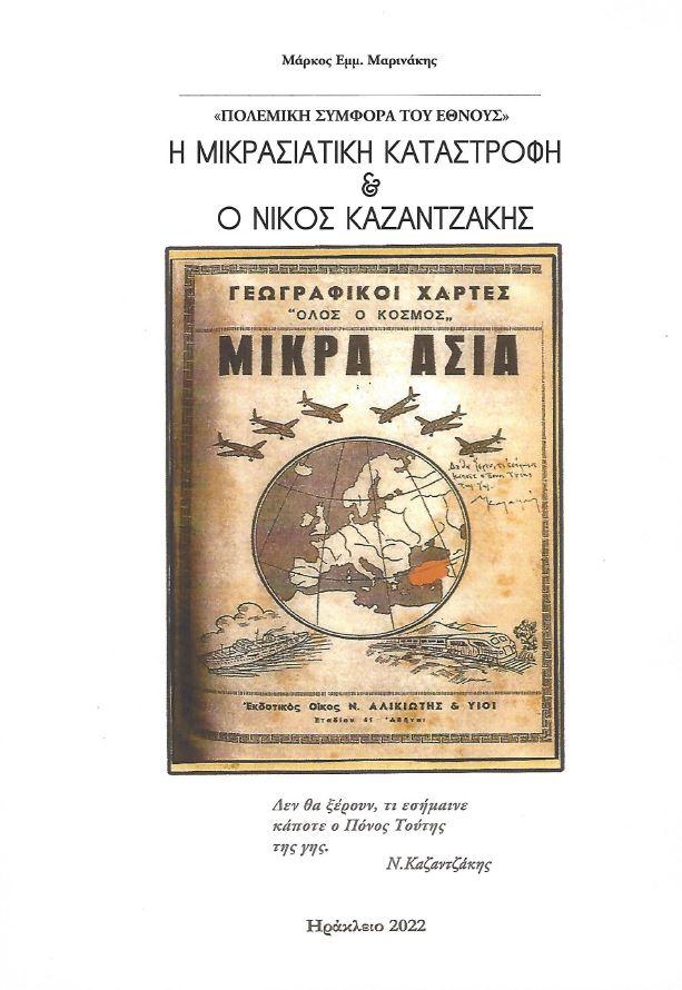 Το νέο βιβλίο του Μάρκου Εμμ. Μαρινάκη, η Μικρασιατική Καταστροφή, μέσα από τα μάτια του Νίκου Καζαντζάκη, είναι άλλος ένας άθλος του δραστήριου ερευνητή και ένθερμου συλλέκτη σπάνιων ντοκουμέντων. Στο παρουσιαζόμενο βιβλίο παραθέτει τα χειρόγραφα κείμενα του Νίκου Καζαντζάκη, που αναφέρονται στη Μικρασιατική Καταστροφή, καθώς και το συναφές πλουσιότατο και άκρως ενδιαφέρον φωτογραφικό υλικό από το Αρχείο του.