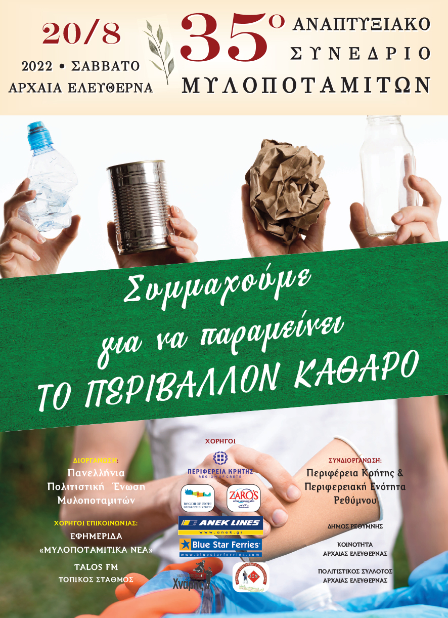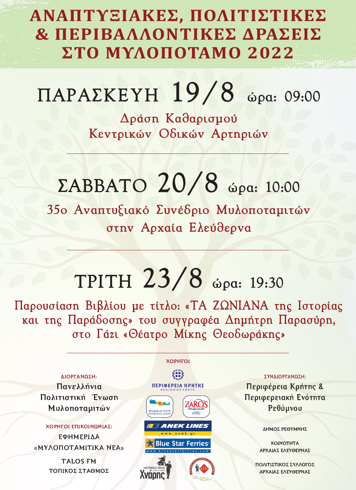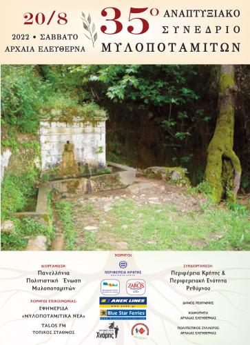 Η «Πανελλήνια Πολιτιστική Ένωση Μυλοποταμιτών», με τη στήριξη της Περιφέρειας Κρήτης, πραγματοποιεί το 35ο Αναπτυξιακό Συνέδριο Μυλοποταμιτών, το Σάββατο 20 Αυγούστου 2022 και ώρα 10:00, στο χωριό Αρχαία Ελεύθερνα (Χώρος Δασικής Αναψυχής «Δάμακας»), του Δήμου Ρεθύμνης. Στη υλοποίηση του Συνεδρίου συμβάλλουν επίσης, ο Δήμος Ρεθύμνης, η Κοινότητα Αρχαίας Ελεύθερνας και ο Πολιτιστικός Σύλλογος Αρχαίας Ελεύθερνας.