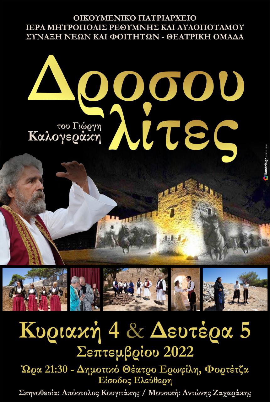 Μετά από τρία χρόνια απουσίας, η Θεατρική Ομάδα της Ιεράς Μητροπόλεως Ρεθύμνης και Αυλοποτάμου, με τις ευλογίες του νέου Ποιμενάρχη μας κ. Προδρόμου, επιστρέφει ξανά. Η φετινή μας προσπάθεια με το έργο «Δροσουλίτες» του Γιώργη Καλογεράκη είχε αρχικά προγραμματιστεί για το 2020, με σκοπό τη συμμετοχή μας στα δρώμενα για τα 200 χρόνια από την Ελληνική Επανάσταση το 2021.