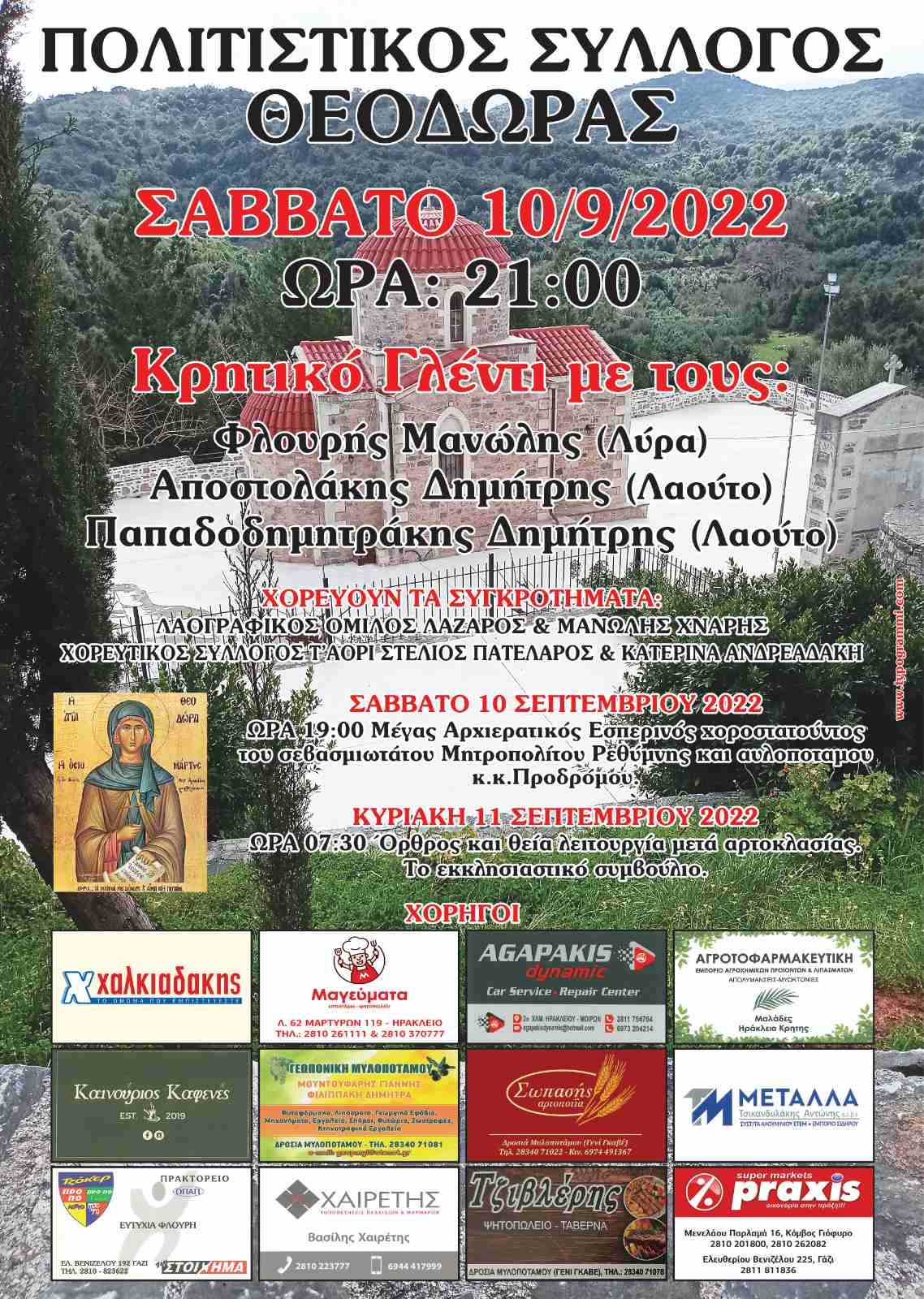 Τις εκδηλώσεις διοργανώνει ο Πολιτιστικός Σύλλογος Θεοδώρας σε συνεργασία με την τοπική ενορία και για πρώτη φορά στην πανέμορφη καινούργια πλατεία του χωριού θα πραγματοποιηθεί Κρητικό Γλέντι με τους Μανώλη Φλουρή στην λύρα και Δημήτρη Αποστολάκη και Δημήτρη Παπαδοδημητράκη στα λαγούτα. Χορεύουν τα συγκροτήματα του Λαογραφικού Ομίλου «Λάζαρος και Μανώλης Χνάρης» καθώς επίσης του χορευτικού συλλόγου «Τ’ Αορι» του Στέλιου Πατελάρου και της Κατερίνας Ανδρεαδάκη.