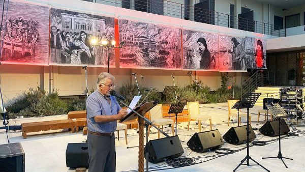 Και όλα αυτά γίνονταν με φόντο τους εξαιρετικούς γιγαντοπίνακες αφιερωμένοι στην Καταστροφή της Μικρασίας, της εικαστικού Εμμανουέλας Πετρακάκη που ήταν άριστα συνυφασμένοι με το θέμα της εκδήλωσης.