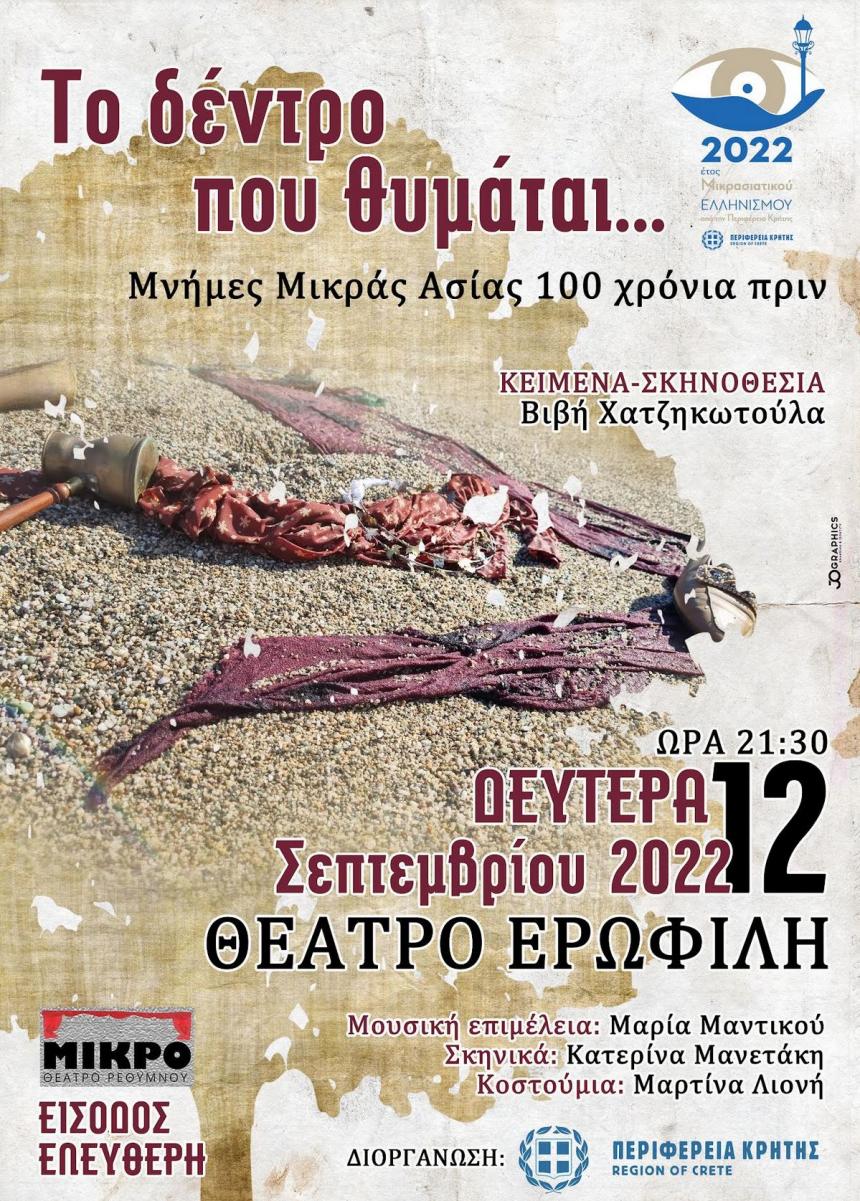 «Το δέντρο πού θυμάται» μια παράσταση – αφιέρωμα στα εκατό χρόνια από τον ξεριζωμό των Ελλήνων της Μικράς Ασίας. Η παράσταση είναι βασισμένη σε μαρτυρίες προσφύγων πρώτης γενιάς που με διάφορους τρόπους και μέσα έφτασαν στην Ελλάδα. Αναδεικνύεται το διπλό δράμα: ο διωγμός από τη γενέθλια γη και η προσπάθεια προσαρμογής στην καινούρια πατρίδα. οι θύμησες, οι προσδοκίες , η νοσταλγία , ο πόνος γίνονται ένα γαϊτανάκι γύρω από το δέντρο της μνήμης. άνθρωποι που είδαν τη ζωή τους να αλλάζει άρδην από τη μια στιγμή στην άλλη , αντιμέτωποι με τη φρίκη του πολέμου , προσπαθούν να βρουν τη δύναμη της ψυχής που θα τους οδηγήσει σε μια καινούρια πατρίδα. Κουβαλούν τα λιγοστά τους υπάρχοντα και ένα μεγάλο γιατί. αυτό το γιατί που κατατρώει όλους τους πρόσφυγες του τότε και του τώρα. ένα αναπάντητο μεγάλο γιατί….