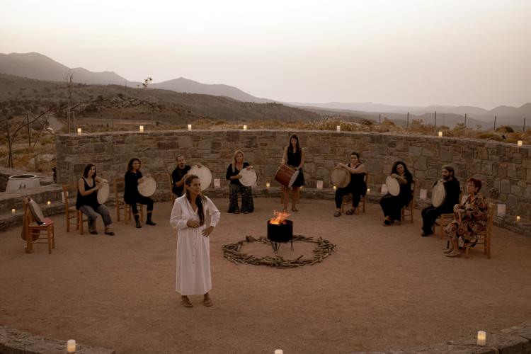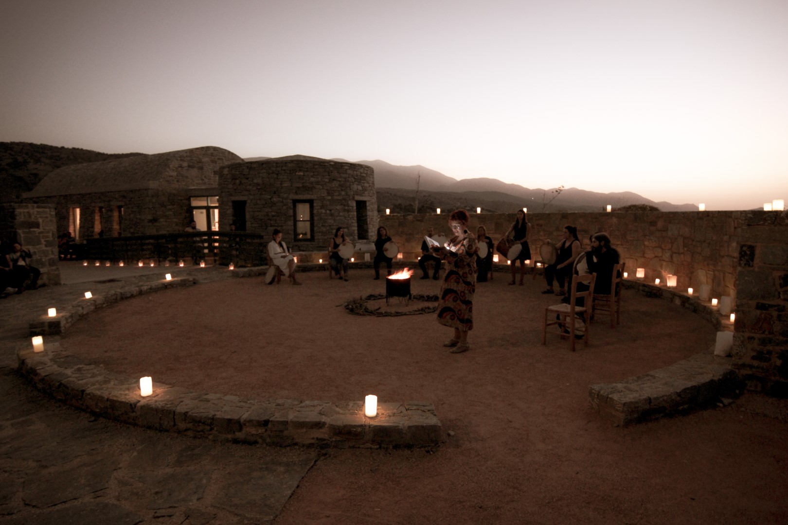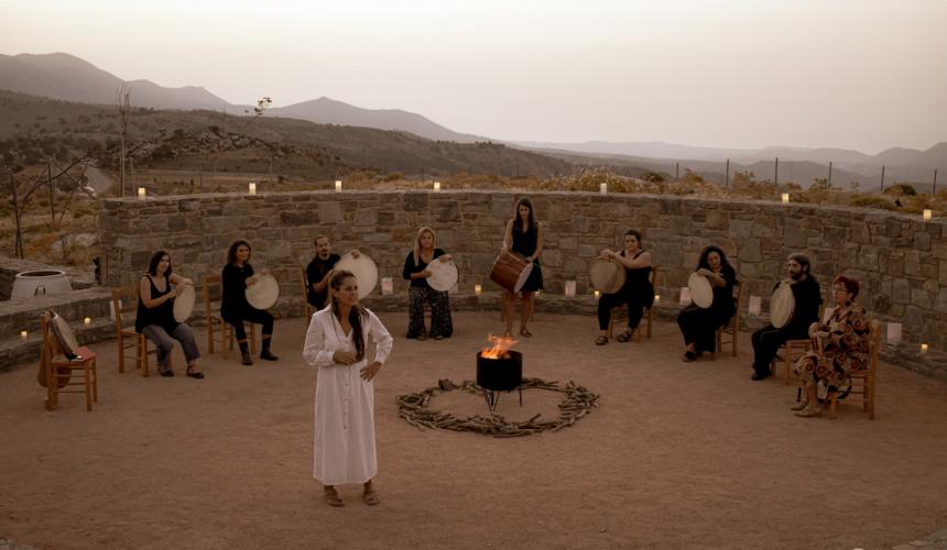 Το μήνυμα ενισχύθηκε ακόμα περισσότερο με τις παράλληλες δράσεις που έλαβαν χώρα στο υπαίθριο αμφιθέατρο του χώρου . Εκεί δόθηκε απο την Τόνια Αυγουστάκη μια συνοπτική περιγραφή της έννοιας της αυτοφροντίδας καθώς και ο συσχετισμός της με το μύθο της φροντίδας του Δία. Στη συνέχεια μαζί με την Ολγα την Αδρεδάκη (εκπαιδευτικό) η οποία ανάγνωσε το μυθο της φροντίδας του Δια γινόταν παράλληλα και ο αποσυμβολισμός του μύθου σε ελεύθερη καλλιτεχνική αποδοση της καλλιτέχνιδος συνοδευόμενη απο τους ήχους της ομάδας κρουστών της Ελεάννα Παπανικολοπούλου (μουσικό -θετρολόγο) αναβιώνοντας τον ήχο των Κουρητών στο σήμερα, δίνοντας τον παλμό της ζωής και υπογραμμίζοντας έτσι την ανάγκη όλων μας να πάμε παρακάτω σε δυσκολους καιρούς. Η βραδυά έκλεισε με κρητικούς ήχους σχετιζόμενους με το μύθο, από τους μουσικούς Μιχάλη Σκουλά (λαούτο) και Δημήτρη Ξιλούρη (λύρα και φωνή) και πάλι συνοδευόμενοι από την ομάδα κρουστών.