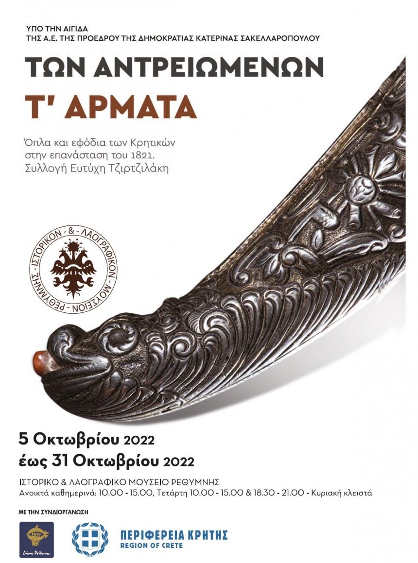 Εγκαινιάζεται την Τετάρτη5η Οκτ., στις 7 και μισή το απόγευμα, στο Ιστορικό-Λαογραφικό μουσείο Ρεθύμνου, η έκθεση «Των αντρειωμένων τ΄ άρματα» - Όπλα και εφόδια των Κρητικών στην Επανάσταση του 1821, Συλλογή Ευτύχη Τζιρτζιλάκη».