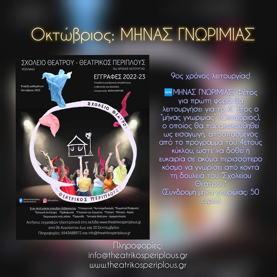 Περισσότερες πληροφορίες για τον «Θεατρικό Περίπλου», ο οποίος λειτουργεί στο Ρέθυμνο σταθερά από το 1988, και για το «Σχολείο Θεάτρου», τα μαθήματα και τους εκπαιδευτές, θα βρείτε στη σελίδα www.theatrikosperiplous.gr