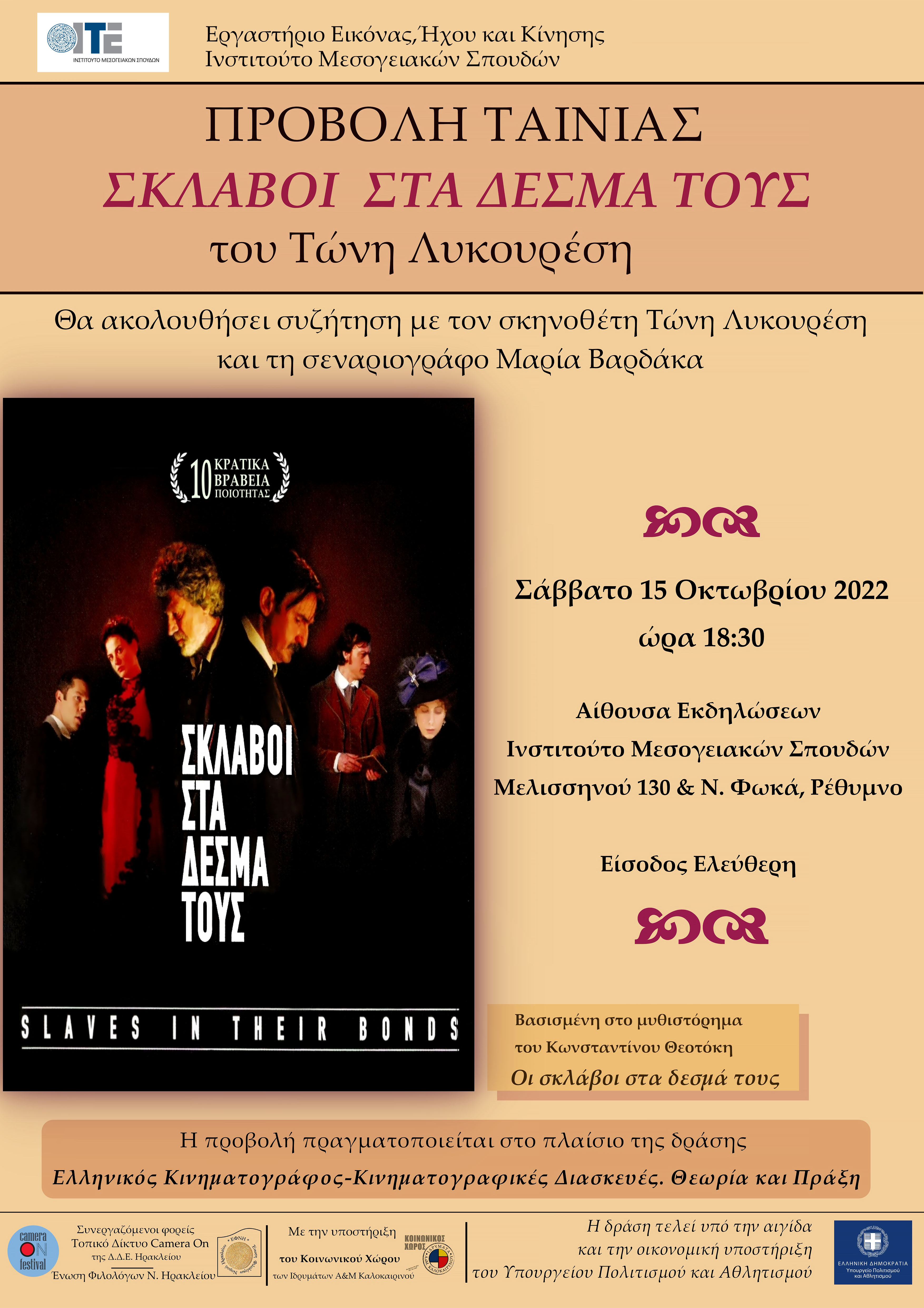 Το Σάββατο 15 Οκτωβρίου 2022, ώρα 18:30, θα προβληθεί στην Αίθουσα Εκδηλώσεων του Ινστιτούτου Μεσογειακών Σπουδών η ταινία Σκλάβοι στα δεσμά τους του Τώνη Λυκουρέση, παρουσία του σκηνοθέτη Τ. Λυκουρέση και της σεναριογράφου Μ. Βαρδάκα. Θα ακολουθήσει συζήτηση των δημιουργών της ταινίας με το κοινό.
