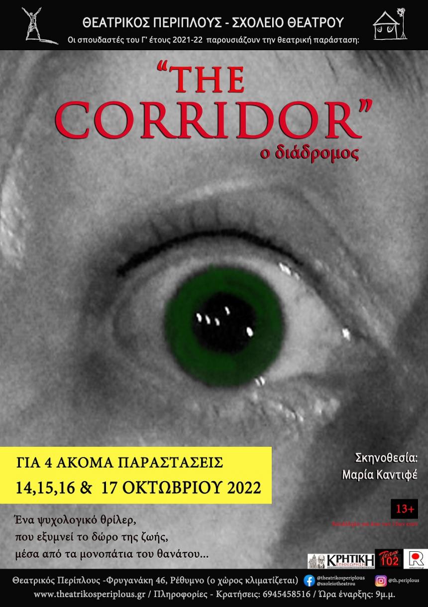 Το «THE CORRIDOR» («ο Διάδρομος»), ήρθε μέσα στο Καλοκαίρι για να αφήσει μια διαφορετική γεύση στην θεατρική ζωή μας... Σόκαρε, προβλημάτισε, έβαλε σε σκέψεις, έθεσε ερωτήματα... Η γεύση όμως ήταν μικρή, μόνο 3ων παραστάσεων... Και τώρα επιστρέφει, γιατί κατά κάποιον τρόπο ήταν αναγκαίο, δεν γινόταν αυτό το έργο και αυτή η δουλειά να μην επικοινωνήσει με όσο περισσότερο κόσμο γίνεται... Μια δουλειά που δημιουργήθηκε από τους εκπαιδευόμενους του Γ΄ έτους του «Σχολείου Θεάτρου», των οποίων οι ερμηνείες επαινέθηκαν τόσο, που φαίνεται πως άλλο ένα μεγάλο στοίχημα για ποιοτικό θέατρο και ουσιαστική καλλιτεχνική αναζήτηση κερδήθηκε από τον «Θεατρικό Περίπλου». Η σκηνοθεσία και η υποκριτική διδασκαλία είναι της Μαρίας Καντιφέ, μιας ηθοποιού με μεγάλη πορεία στο επαγγελματικό θέατρο της Αθήνας, που πραγματικά πρέπει να είναι τιμή μας που δραστηριοποιείται στην πόλη μας.
