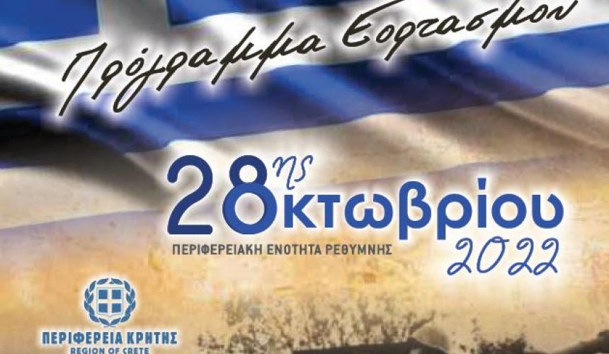 Γενικός σημαιοστολισμός δημοσίων, δημοτικών, ιδιωτικών καταστημάτων και σπιτιών της πόλης του Ρεθύμνου από τις 8 το πρωί της 26ης μέχρι και τη Δύση του ηλίου της 28ης Οκτωβρίου.