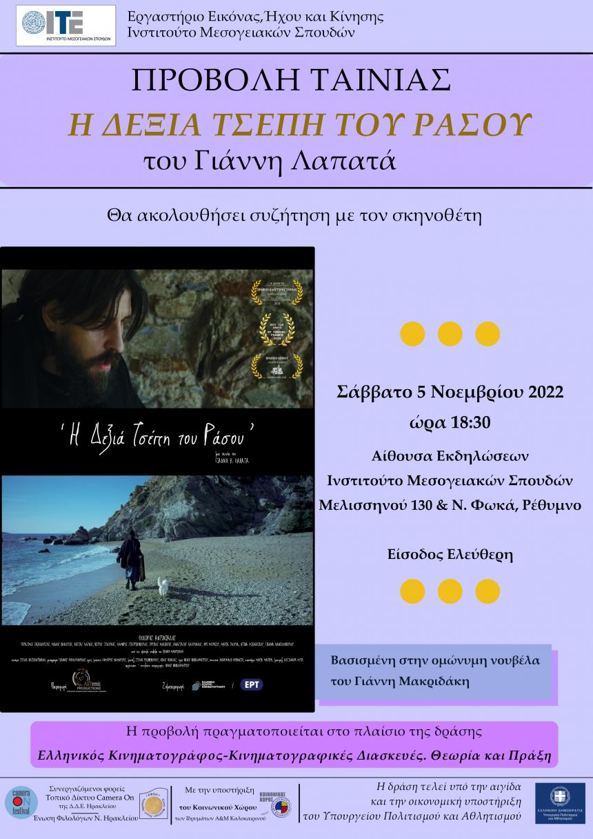 Το Σάββατο 5 Νοεμβρίου 2022, ώρα 18:30, θα προβληθεί στην Αίθουσα Εκδηλώσεων του Ινστιτούτου Μεσογειακών Σπουδών η ταινία Η δεξιά τσέπη του ράσου του Γιάννη Λαπατά, παρουσία του σκηνοθέτη. Θα ακολουθήσει συζήτηση του σκηνοθέτη Γιάννη Λαπατά με το κοινό.