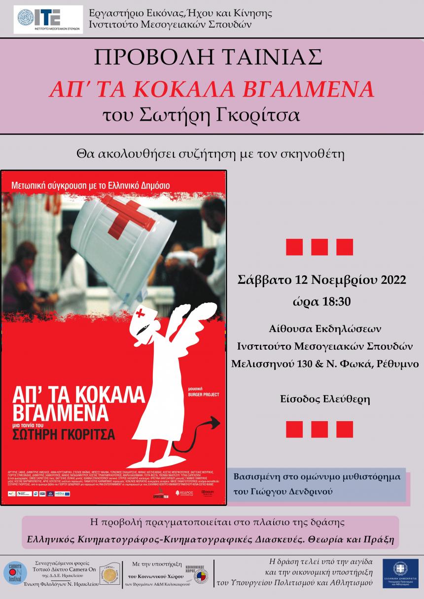 Το Σάββατο 12 Νοεμβρίου 2022, ώρα 18:30, θα προβληθεί στην Αίθουσα Εκδηλώσεων του Ινστιτούτου Μεσογειακών Σπουδών η ταινία Απ’ τα κόκαλα βγαλμένα του Σωτήρη Γκορίτσα, παρουσία του σκηνοθέτη. Θα ακολουθήσει συζήτηση του σκηνοθέτη Σωτήρη Γκορίτσα με το κοινό.