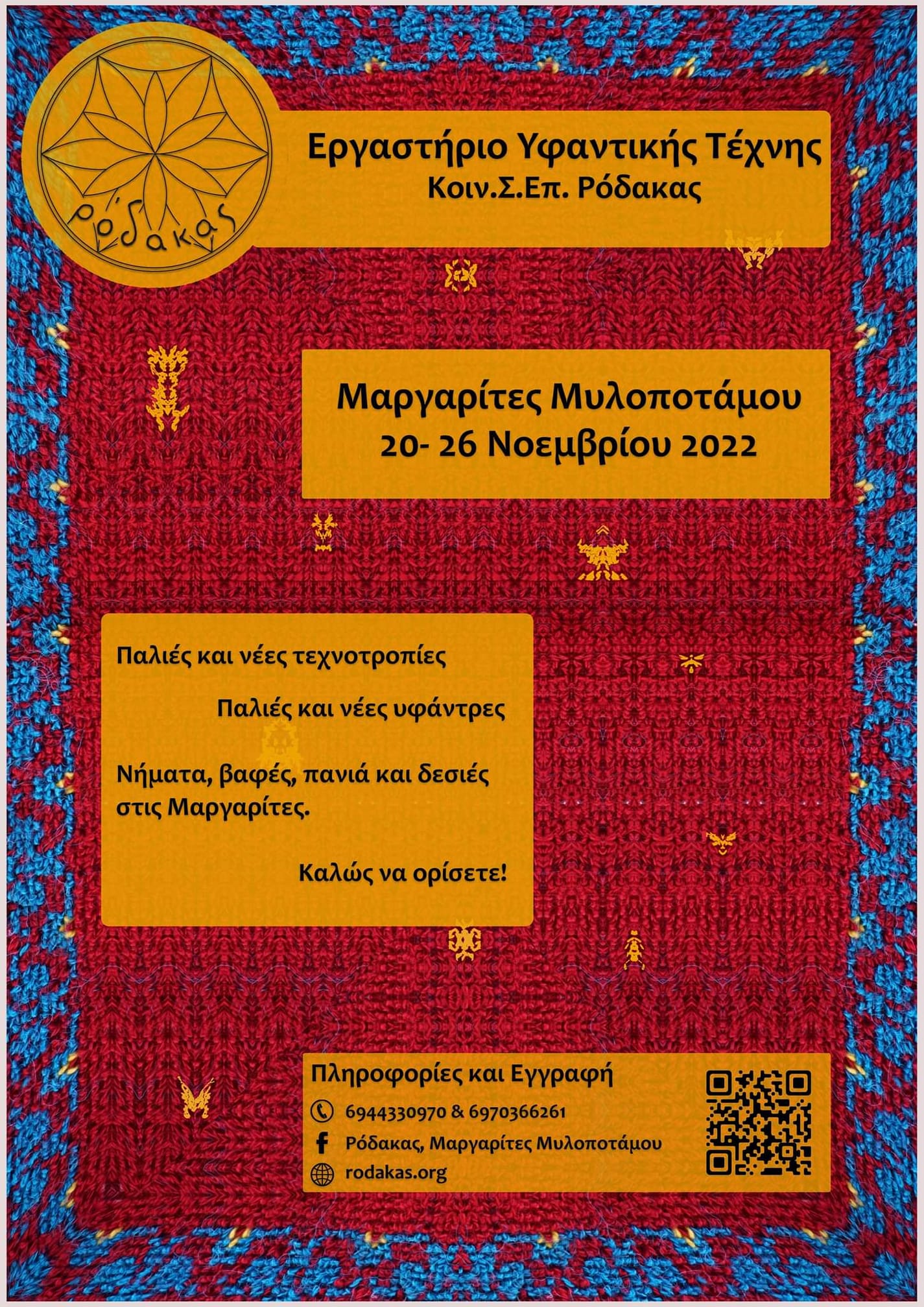 Η ομάδα της ΚΟΙΝ.Σ.ΕΠ. ΡΟΔΑΚΑΣ, στα πλαίσια του Εργαστηρίου Υφαντικής του ΡΟΔΑΚΑ το οποίο διεξάγεται στις Μαργαρίτες Μυλοποτάμου από τις 20 έως τις 26 Νοεμβρίου, οργανώνει εκδήλωση με τίτλο: