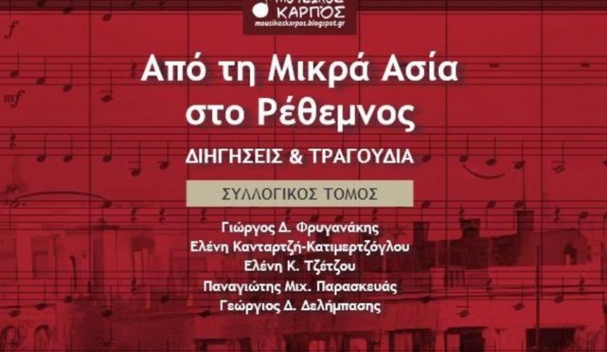Με αφορμή την παρουσίαση του Συλλογικού Τόμου από τον Μουσικό Καρπό με θέμα: ¨Από τη Μικρά Ασία στο Ρέθεμνος¨ που θα πραγματοποιηθεί την Κυριακή 11 Δεκεμβρίου και ώρα 12:30, στην αίθουσα Παντελή Πρεβελάκη με ελεύθερη είσοδο, οι παρευρισκόμενοι θα έχουν την ευκαιρία να ακούσουν ιστορίες μικρασιατών προσφύγων δεύτερης γενιάς, που εγκατέλειψαν τη γενέθλια γη για να εγκατασταθούν στο Ρέθυμνο, καθώς και μικρασιάτικα τραγούδια. Στον τόμο, που συνυπογράφουν ο Γιώργος Φρυγανάκης, η Ελένη Κανταρτζή-Κατιμερτζόγλου, η Ελένη Τζέτζου, ο Παναγιώτης Παρασκευάς και ο Γεώργιος Δελήμπασης, σε εισαγωγή του Νίκου Δερεδάκη, παρουσιάζονται, μικροϊστορικά, οικογενειακές και τοποσημικές ιστορίες, καθώς και 14 παρτιτούρες μικρασιάτικων τραγουδιών, τα περισσότερα από αυτά, αγνώστων συνθετών.
