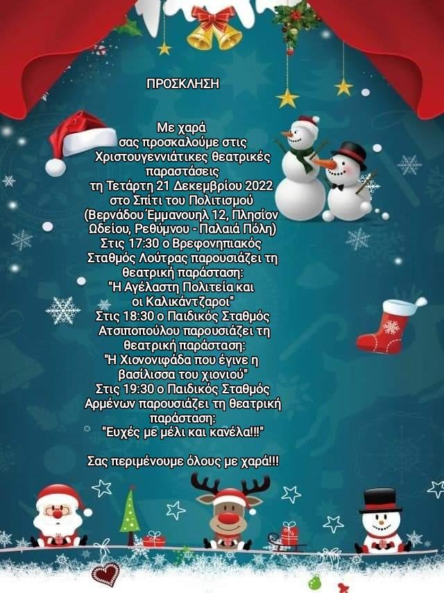 Θεατρικές παραστάσεις με χριστουγεννιάτικο πνεύμα και πρωταγωνιστές τους μικρούς φιλοξενούμενους των Δημοτικών Παιδικών Σταθμών του Δήμου Ρεθύμνης, θα έχουν την ευκαιρία ν’ απολαύσουν την Τετάρτη 21 Δεκεμβρίου 2022, στο «Σπίτι Πολιτισμού», όλοι οι συμπολίτες.