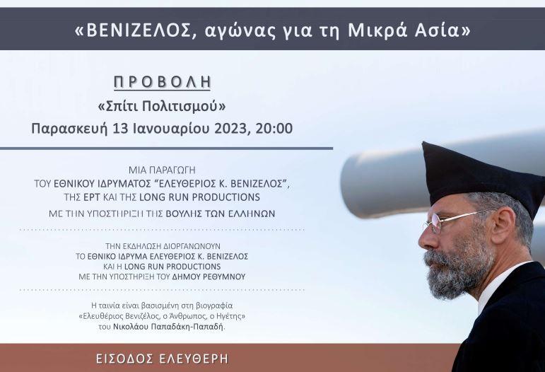 Το δραματοποιημένο ντοκιμαντέρ-συμπαραγωγή του Εθνικού Ιδρύματος Ερευνών και Μελετών «Ελευθέριος Κ. Βενιζέλος», της ΕΡΤ και της Long Run Productions, «ΒΕΝΙΖΕΛΟΣ, αγώνας για τη Μικρά Ασία» θα παρουσιαστεί την Παρασκευή 13 Ιανουαρίου στις 20:00, στο «Σπίτι Πολιτισμού» στο Ρέθυμνο. Η εκδήλωση διοργανώνεται από το Εθνικό Ίδρυμα «Ελευθέριος Κ. Βενιζέλος» και τη Long Run Productions, με την υποστήριξη του Δήμου Ρεθύμνου.