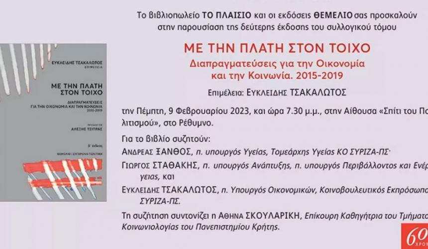 Οι εκδόσεις ΘΕΜΕΛΙΟ και το βιβλιοπωλείο ΤΟ ΠΛΑΙΣΙΟ διοργανώνουν παρουσίαση βιβλίου στο Ρέθυμνο. Πρόκειται για τη δεύτερη έκδοση του συλλογικού τόμου "Με την πλάτη στον τοίχο - Διαπραγματεύσεις για την οικονομία και την κοινωνία. 2015-2019" σε επιμέλεια του Ευκλείδη Τσακαλώτου και με πρόλογο του Αλέξη Τσίπρα.