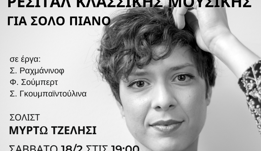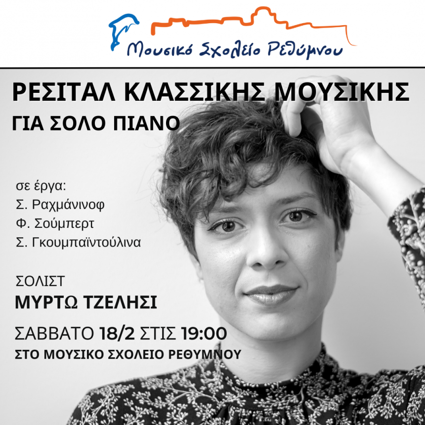 Το Μουσικό Σχολείο Ρεθύμνου διοργανώνει Ρεσιτάλ Κλασικής Μουσικής για σόλο Πιάνο το Σάββατο 18 Φεβρουαρίου και ώρα 19:00 στο χώρο του σχολείου στην αίθουσα Ν. Μαμαγκάκη.