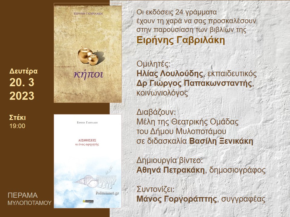 Στην εκδήλωση θα παρουσιαστούν τα βιβλία "Κήποι" και "Αισθήσεις και ένας αφηγητής" με ομιλητές τον εκπαιδευτικό Ηλία Λουλούδη και τον κοινωνιολόγο Γιώργο Παπακωνσταντή.
