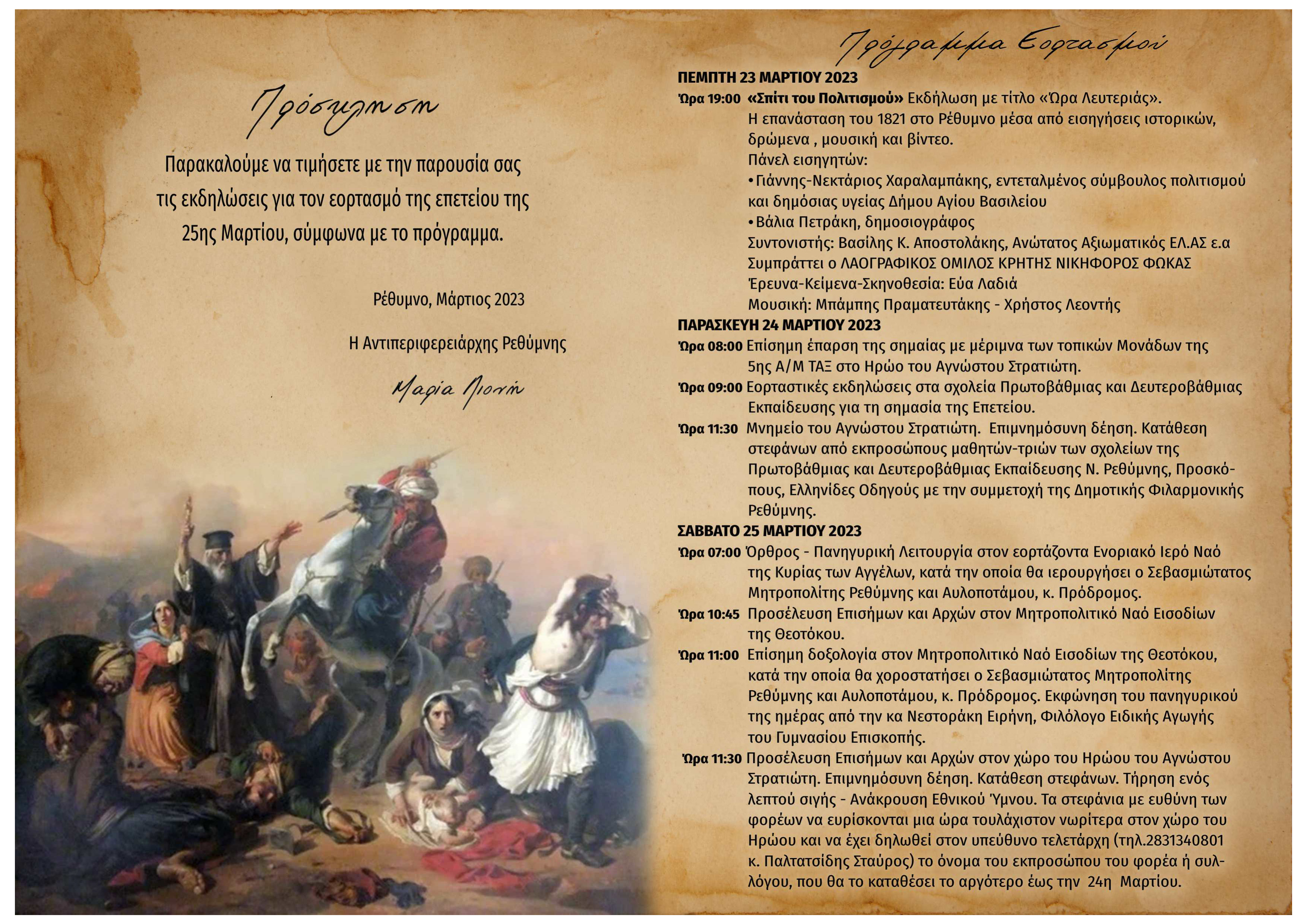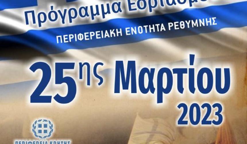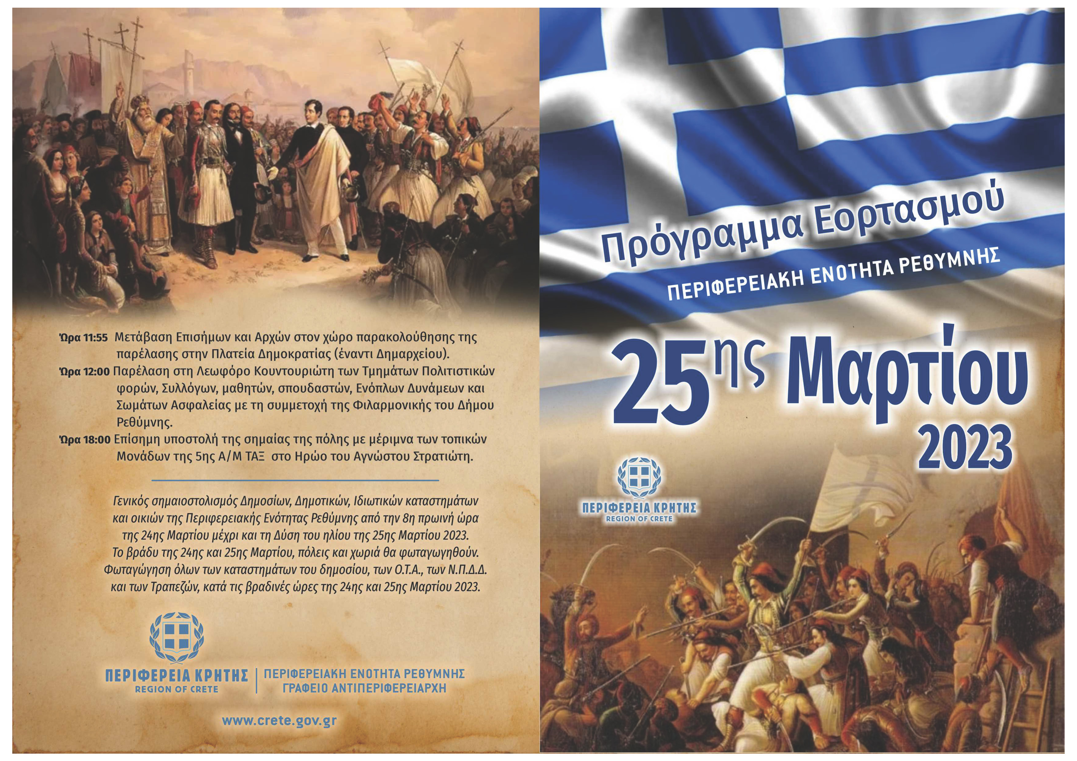 Γενικός σημαιοστολισμός Δημοσίων, Δημοτικών, Ιδιωτικών καταστημάτων και οικιών της Περιφερειακής Ενότητας Ρεθύμνης από την 8η πρωινή ώρα της 24ης Μαρτίου μέχρι και τη Δύση του ηλίου της 25ης Μαρτίου 2023.