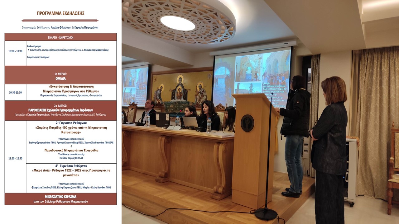 Οι εκπαιδευτικοί κ. Ειρήνη Φραγκιαδάκη, κ. Αργυρώ Σπανουδάκη, κ. Χρυσούλα Βαονάκη και κ. Παύλος Τομζάς είχαν την ευθύνη της παρουσίασης των δράσεων μαθητών και μαθητριών του 2ου Γυμνασίου Ρεθύμνου με τίτλο: «Χαμένες Πατρίδες 100 χρόνια από τη Μικρασιατική Καταστροφή». Αντίστοιχα οι εκπαιδευτικοί κ. Φλωρέττα Συκιώτη, κ. Ελένη Καραντζίκου και κ. Μαρία - Ελένη Βασάκη είχαν την ευθύνη της παρουσίασης των δράσεων μαθητών και μαθητριών του 4ου Γυμνασίου Ρεθύμνου με τίτλο: «Μικρά Ασία - Ρέθυμνο 1922 – 2022 στης Προσφυγιάς τα μονοπάτια».