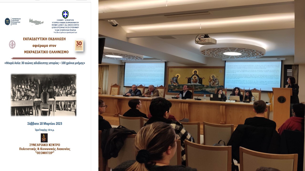Μια συγκινητική στιγμή ήταν ο διάλογος που άνοιξαν με την ιστορία, το Σάββατο 18 Μαρτίου 2023 στο Συνεδριακό Κέντρο της Πολιτιστικής και Κοινωνικής Διακονίας «ΘΕΟΜΗΤΩΡ» της Ιεράς Μητρόπολης Ρεθύμνου και Αυλοποτάμου, οι μαθητές και οι μαθήτριες του 2ου και 4ου Γυμνασίου Ρεθύμνου με τους ανθρώπους του Μικρασιατικού Ελληνισμού, που άφησαν πίσω τους την Μικρά Ασία το 1922 και ήρθαν στο Ρέθυμνο, στη νέα τους πατρίδα.