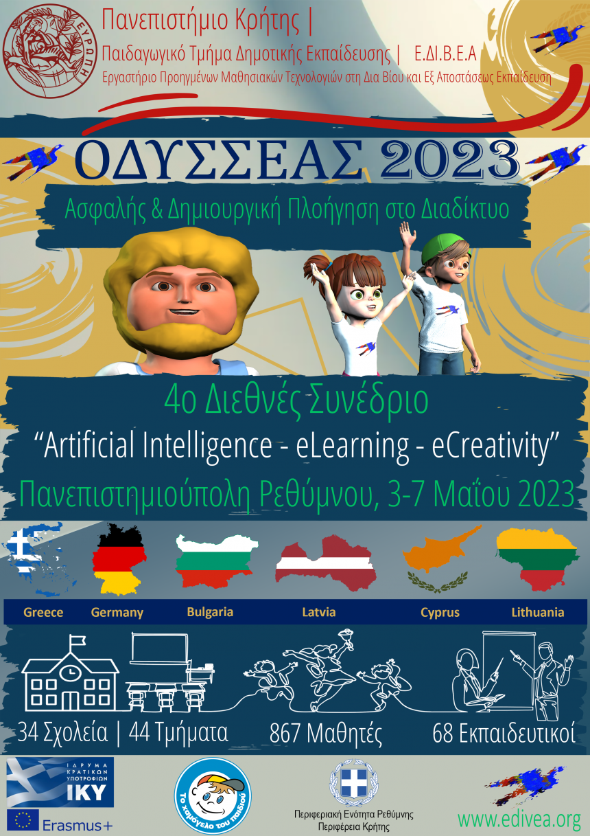 Το Εργαστήριο Δια Βίου και εξ αποστάσεως Εκπαίδευσης [Ε.ΔΙ.Β.Ε.Α], του Παιδαγωγικού Τμήματος Δ.Ε του Πανεπιστημίου Κρήτης στο πλαίσιο του Προγράμματος Μεταπτυχιακών Σπουδών : «Επιστήμες της Αγωγής - Εξ Αποστάσεως Εκπαίδευση με την χρήση των ΤΠΕ» διοργανώνει το 4ο Διεθνές Συνέδριο με θέμα: ««Artificial Intelligence -eLearning - eCreativity 2023», 3-7 Μαΐου, στην Πανεπιστημιούπολη Ρεθύμνου.