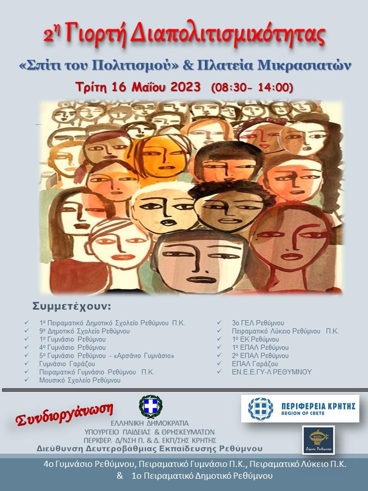 Η Εκπαιδευτική Εκδήλωση με Τίτλο: 2η Γιορτή Διαπολιτισμικότητας θα πραγματοποιηθεί την Τρίτη 16 Μαΐου 2023 με ώρα έναρξης 09:00 σε χώρους του Δήμου Ρεθύμνου, στο «Σπίτι του Πολιτισμού» και στην Πλατεία Μικρασιατών.