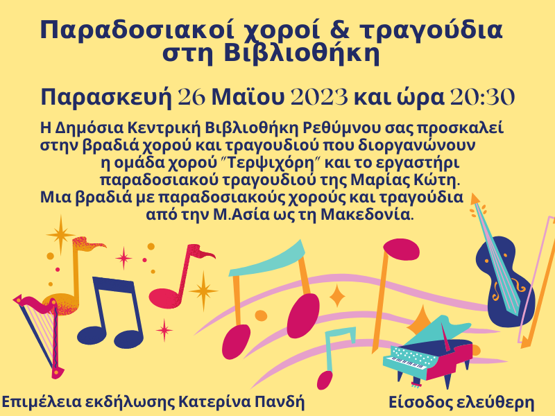 Στη Δημόσια Κεντρική Βιβλιοθήκη Ρεθύμνου την Παρασκευή 26 Μάϊου και ώρα 20:30 θα πραγματοποιηθεί μουσική βραδιά με παραδοσιακούς χορούς και τραγούδια από τη Μ. Ασία ως τη Μακεδονία, που διοργανώνεται από τη χορευτική ομάδα «Τερψιχόρη» και το εργαστήρι παραδοσιακού τραγουδιού της Μαρίας Κώτη.