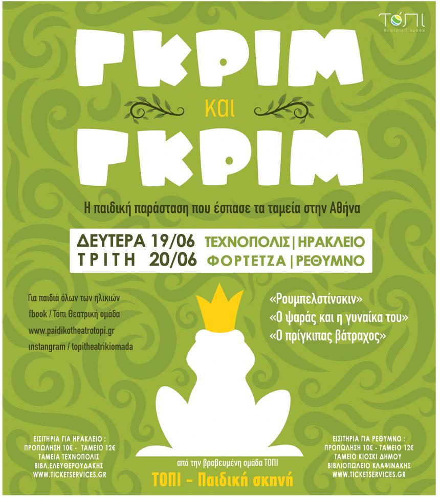 Η αγαπημένη θεατρική ομάδα ΤΟΠΙ μετά τις επιτυχίες «Ο τρομερός εχθρός και ο αλυσοδεμένος ελέφαντας» του Χ. Μπουκάι και «Παραμύθια για να σπάτε κέφι» του Τζιάνι Ροντάρι, παραστάσεις που παρακολούθησαν χιλιάδες θεατές σε ολόκληρη την Ελλάδα, με την σκηνοθετική υπογραφή του Δημήτρη Πλειώνη, εμπνέεται από τα παραμύθια των αδελφών Γκριμ και δημιουργεί ένα ολοκαίνουργιο έργο γεμάτο συναισθήματα και μηνύματα για τα σημερινά παιδιά.