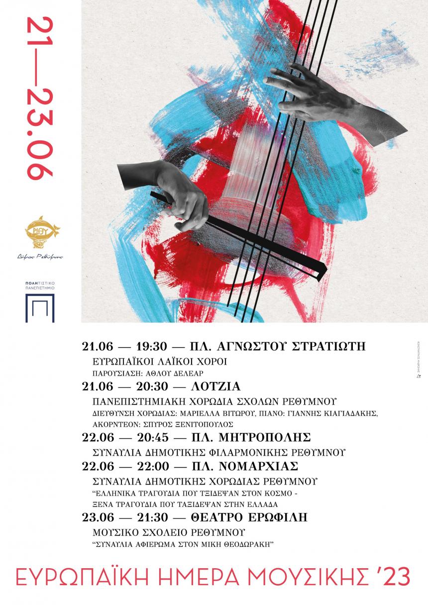 Με αφορμή τον εορτασμό της Ευρωπαϊκής Ημέρας Μουσικής, ο Δήμος Ρεθύμνης/Τμήμα Πολιτισμού,διοργανώνει τριήμερο εκδηλώσεων σε ανοιχτούς χώρους και πλατείες της πόλης. Οι εκδηλώσεις θα λάβουν χώρα από αύριο Τετάρτη 21 Ιουνίου έως την Παρασκευή 23 Ιουνίου.