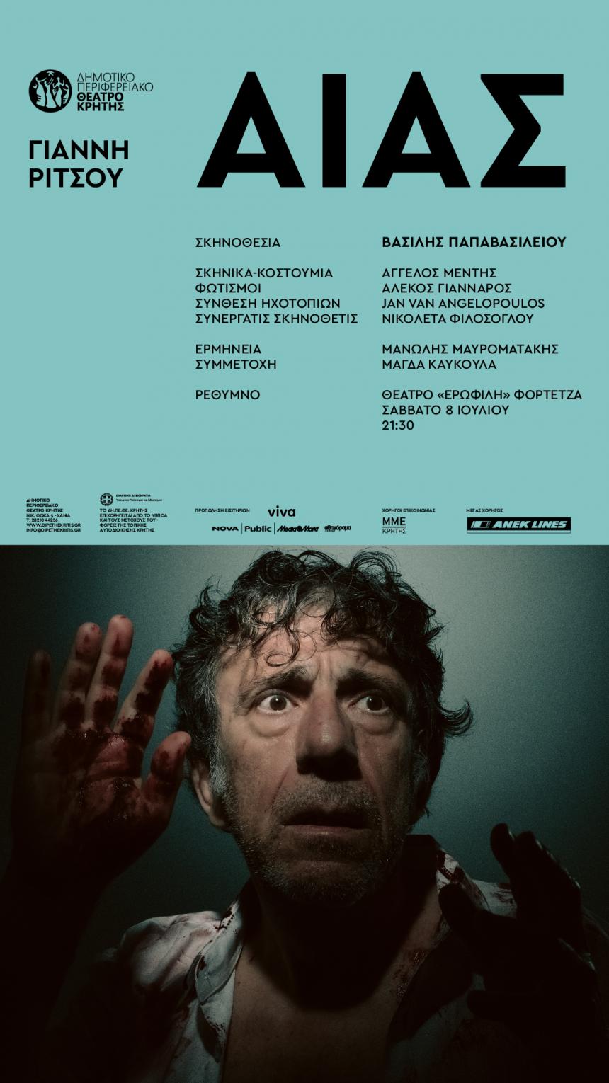 Η παράσταση «Αίας» του Γιάννη Ρίτσου, καλοκαιρινή παραγωγή του ΔΗΠΕΘΕ Κρήτης, για την περίοδο 2022-23, κάνει πρεμιέρα στα Χανιά, στο Αρχαίο Θέατρο της Απτέρας στις 30 Ιουνίου, σε σκηνοθεσία Βασίλη Παπαβασιλείου και με μια εξαιρετική ομάδα ηθοποιών και συντελεστών. Η παράσταση θα περιοδεύσει στη συνέχεια σε όλη την Κρήτη και σε επιλεγμένα Φεστιβάλ στην Αθήνα.