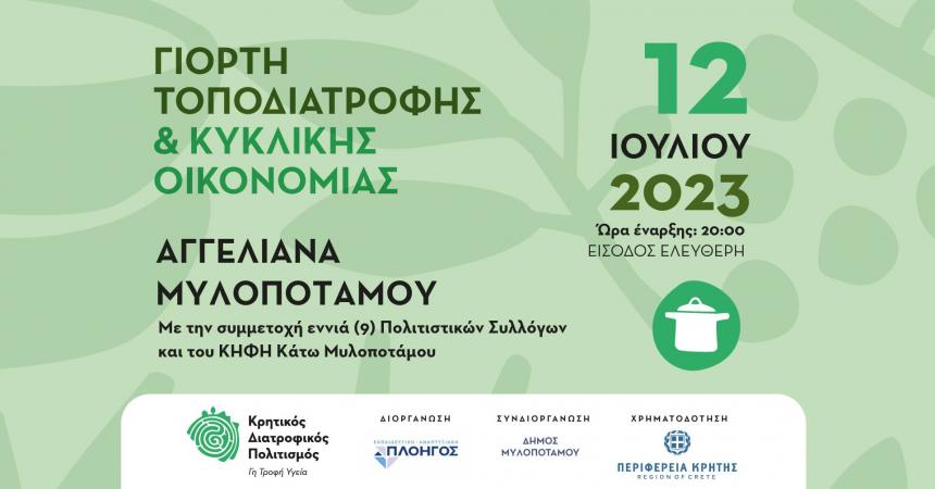 Με τη γιορτή τοποδιατροφής στα Αγγελιανά συνεχίζονται αύριο οι δράσεις, εν’ όψει των τριήμερων εκδηλώσεων του Θεσμού «Κρητικός Διατροφικός Πολιτισμός. Γη- Τροφή- Υγεία» που θα πραγματοποιηθεί 14, 15 και 16 Ιουλίου 2023 στις Μαργαρίτες Μυλοποτάμου.