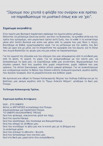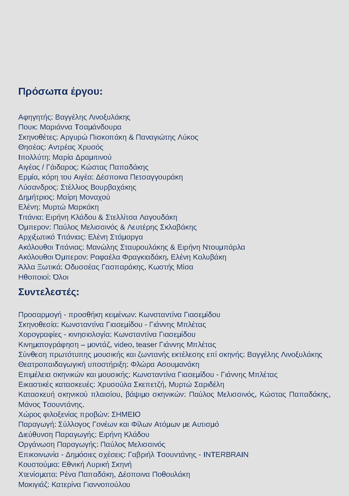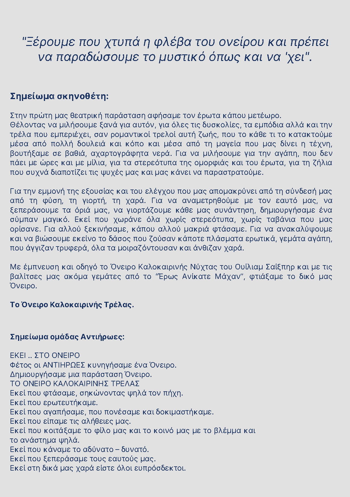 Η παράσταση, η οποία είναι εμπνευσμένη από το Όνειρο Καλοκαιρινής Νύχτας του Ουίλιαμ Σαίξπηρ, αποτελεί μια παραγωγή του ενεργού στους αγώνες για την αναπηρία Σύλλογος Γονέων Ατόμων με Αυτισμό Ρεθύμνου.